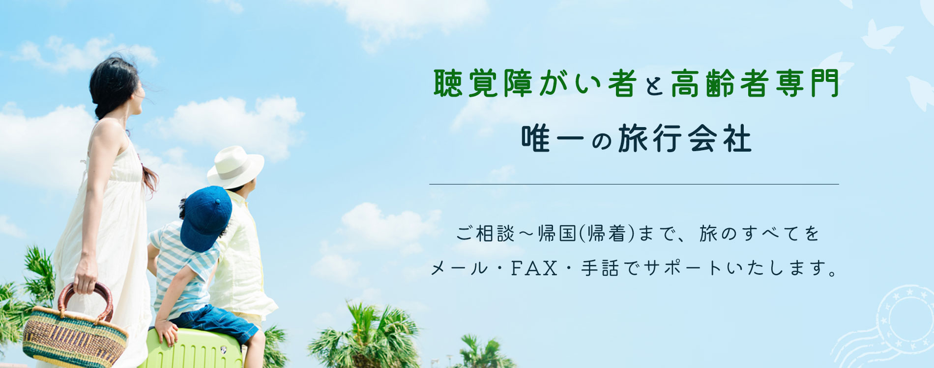 ご相談から旅程作成や観光、ホテル、食事などすべてをご提案いたします。国内旅行および海外旅行において、グループ旅行から個人旅行を問わずご対応させていただきます。 なお、ご希望でございましたら、ろう者のお客さまに、手話が出来る添乗員が同行する安心の旅をご提供させていただきます。